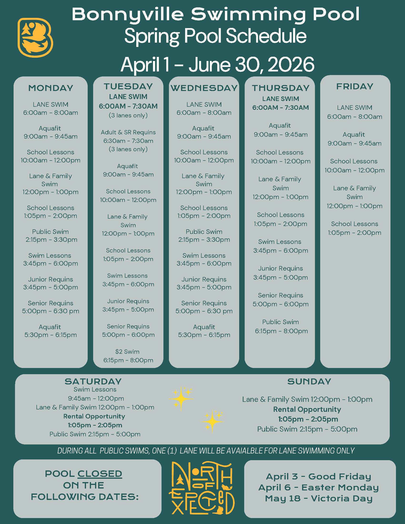 Early Bird Lane Swim: Kick off your weekday mornings with an energizing swim at the Bonnyville Swimming Pool! Morning swims are for continuous lap swimming, so whether you’re training or simply staying active, this time is all about focus and flow. While the diving board and slide won’t be available, the sauna will be ready and waiting to warm you up post-swim. Dive in and make your mornings “North of Expected!”