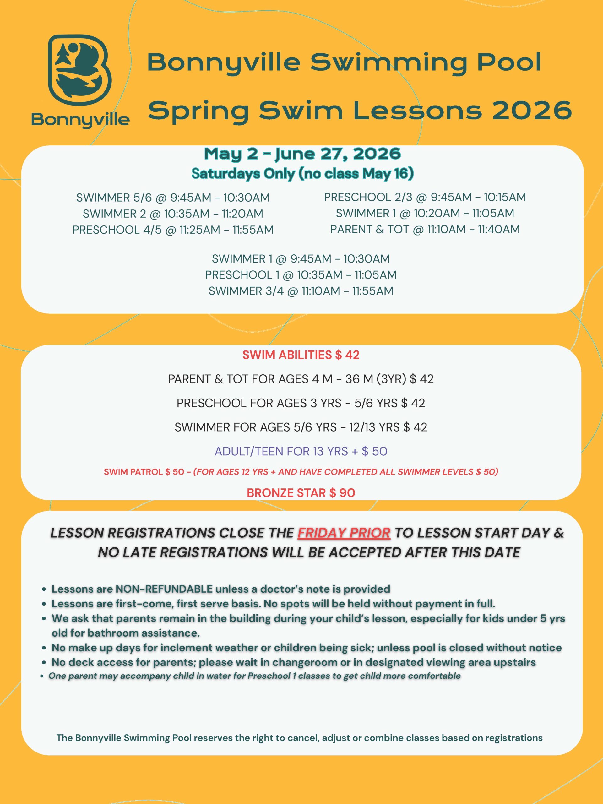 - No make up days for weather or children being sick; unless pool is closed.
