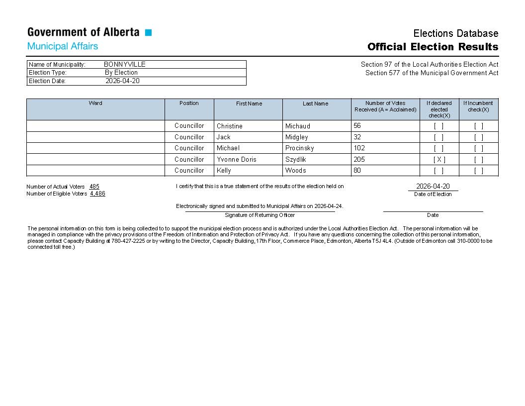 The official results for the Town of Bonnyville’s 2026 Municipal By-Election have been declared.